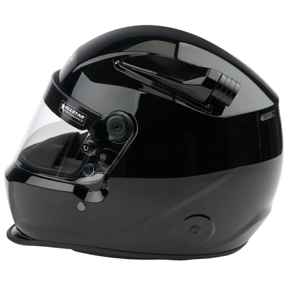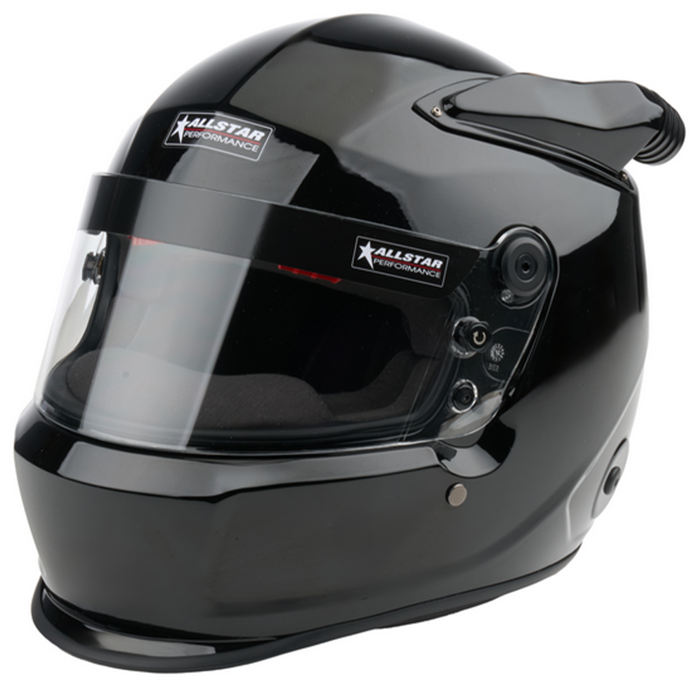 ALLSTAR Performance Series 50 Mid-Air Racing Helmet Gloss Black Snell SA2025. Get cooler during hot Summer races by hooking up this Helmet to your Forced Air Blower. The mid level mounted air inlet port is designed to minimize interference and clearance issues.