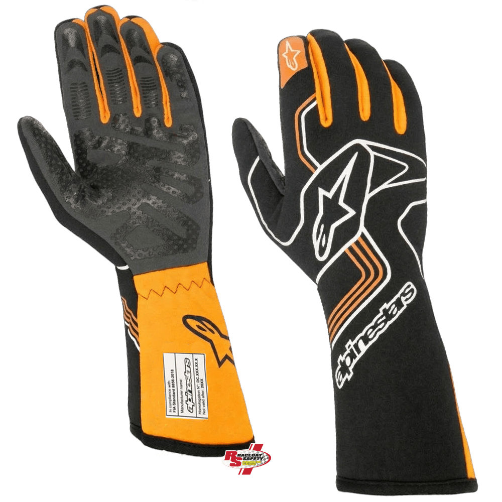 Alpinestars Tech-1 RACE V3 Gloves in Black and Orange Fluo. Alpinestars' unending quest for perfection leads us to V3 or Version 3 of the popular Tech-1 RACE series of Racing Gloves. The Fluorescent Orange highlighting is just enough for subtle statement styling and also just enough to warn other drivers when your hand is waving out the window opening. Lightweight flame retardant fabric, pre-curved fingers along with silicon palm printing for maximum grip result in a premium, professional race glove for drivers who demand the best.