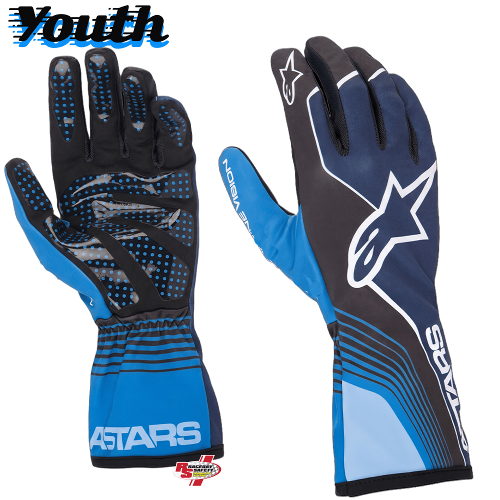 Alpinestars Youth Tech-1 K RACE S V2 "FUTURE" Kart Racing Gloves in Navy Blue and Crest. The best kart racing gloves in the motorsports industry are worthy of the long and complex name. Sized to properly fit your young racing star.