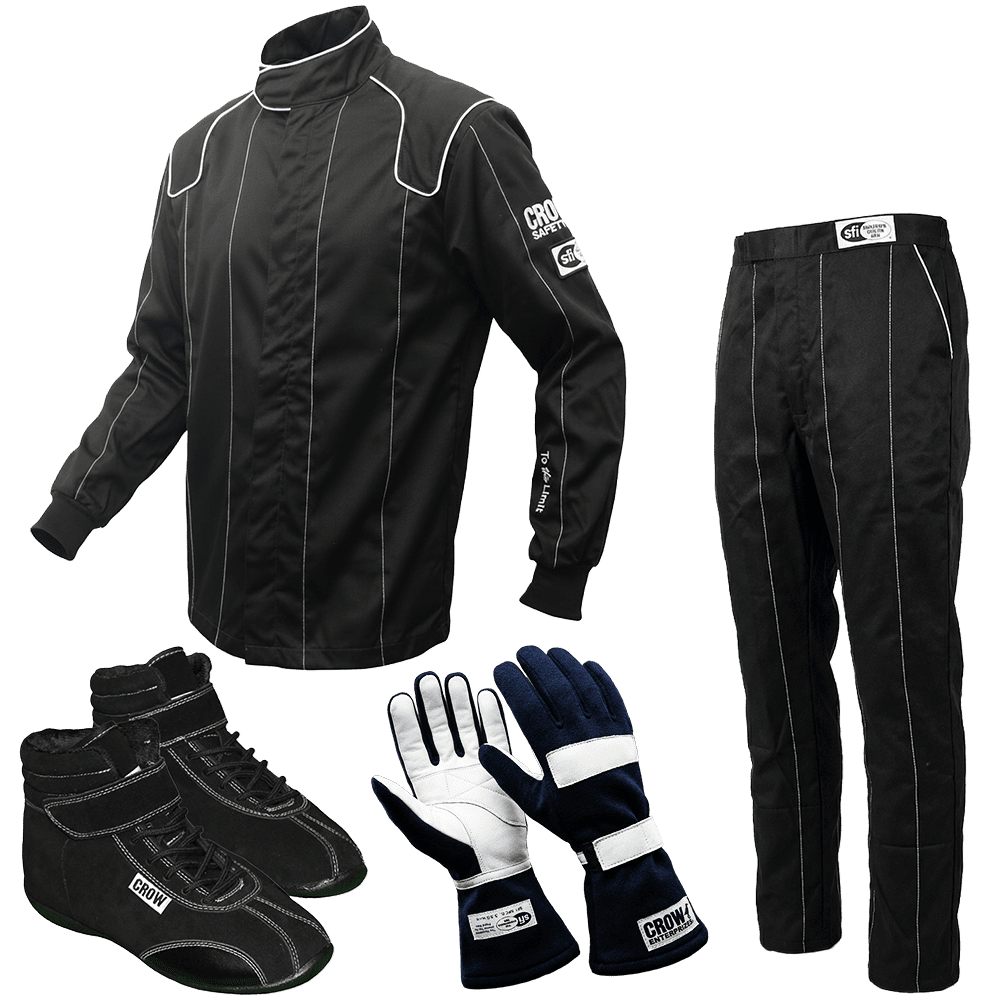 • The Crow Legacy Race Suit (Jacket and Pant) features main body Black flame retardant fabric, highlighted with vertical accent stitching and the "To the Limit" embroidery on the Jacket's left lower sleeve. The same SFI 3.2A/1 certification as Crow's standard junior racing Jacket and Pant, but 22% lighter.