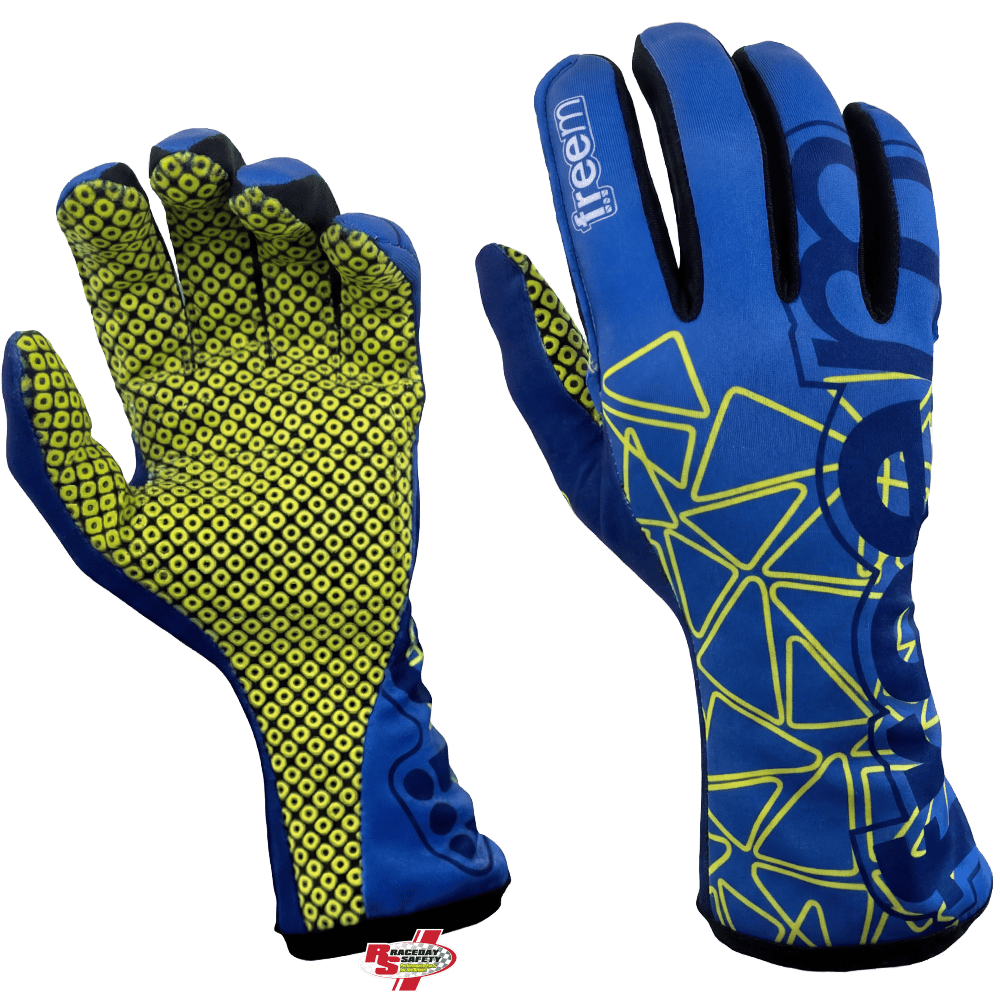 Freem K-Slight 22 Kart Racing Gloves Blue/Flo Yellow. Formed in Italy, "Freem" or "Free M" have established themselves with European racers as a premier Race Gear company. Now being stocked at RaceDay Safety and available to USA and Canada racers wanting to experience the innovative products of FreeM.