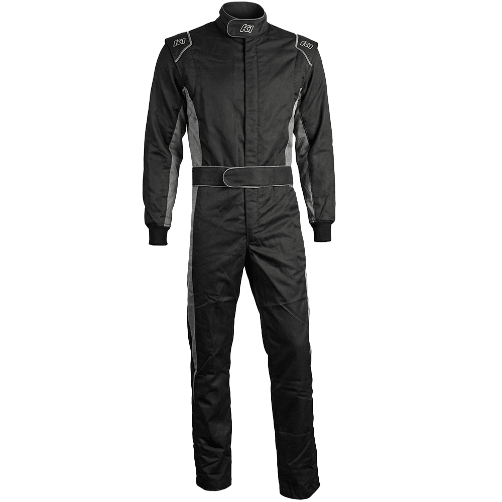 K1 RaceGear Challenger Racing Suit Black/Gray. RaceDay Safety and K1 RaceGear collaborate to offer racers a wider variety of color options through our semi-custom race suit program. Modern, fast looking design with dual, right side Gray sleeve and leg stripes that smoothly terminate with an angled cut. Black main body with Gray side torso and inner arm panels. Gray trim also highlights shoulder epaulets, collar and beltline.