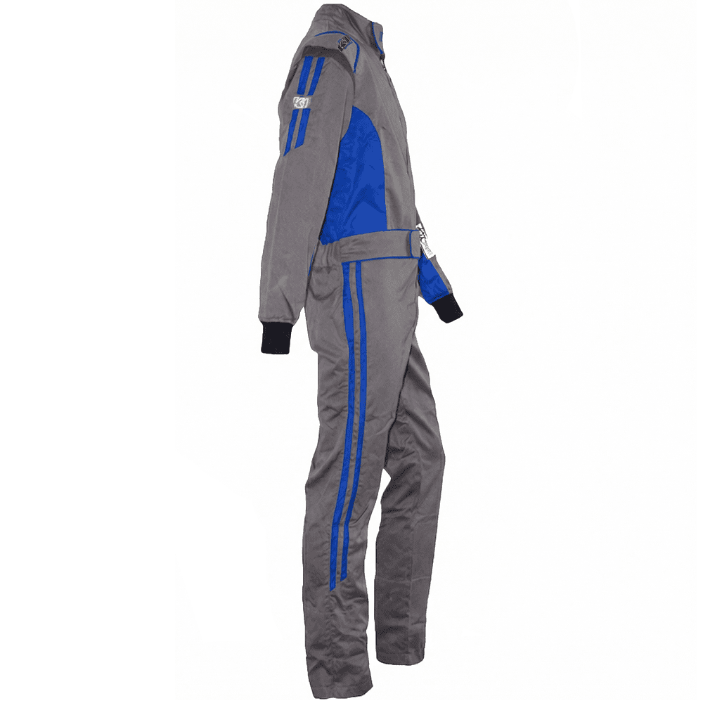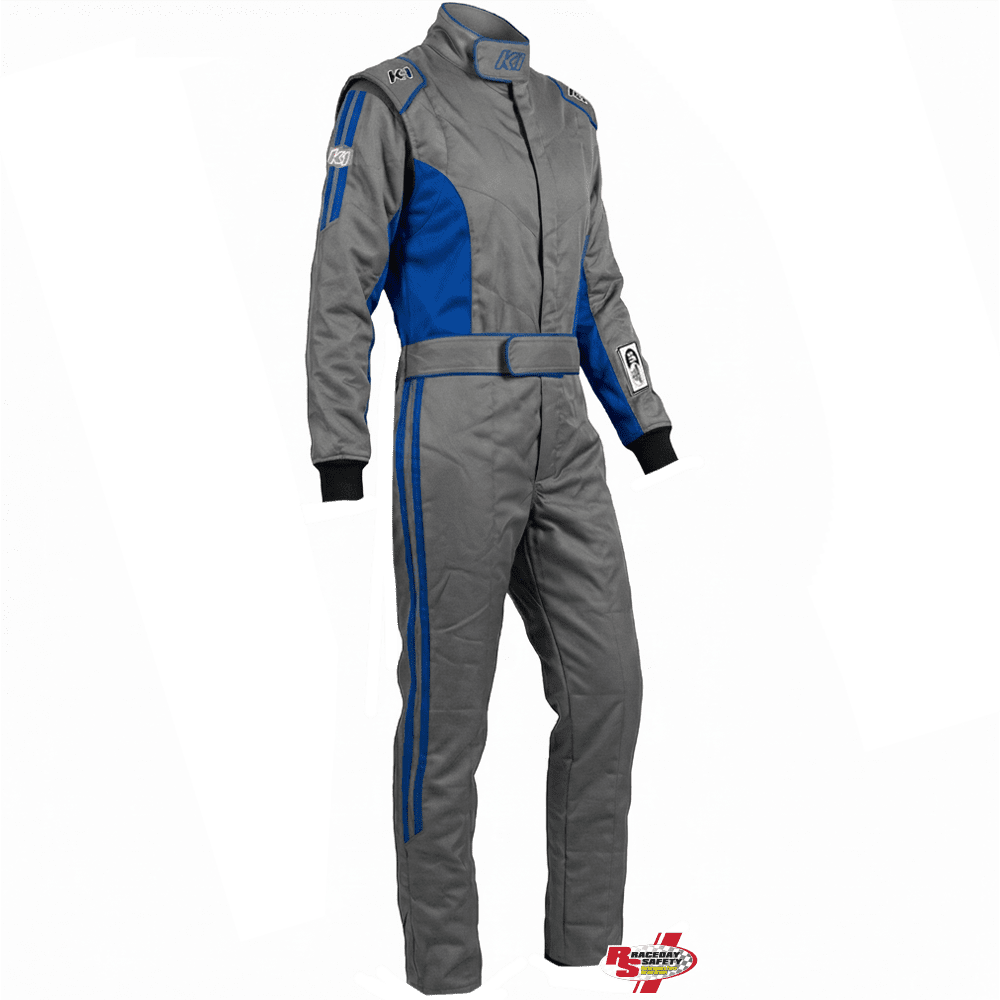 K1 RaceGear Challenger Racing Suit Gray/Blue. RaceDay Safety and K1 RaceGear collaborate to offer racers a wider variety of color options through our semi-custom race suit program. Modern, fast looking design with dual, right side Blue sleeve and leg stripes that smoothly terminate with an angled cut. Gray main body with Blue side torso and inner arm panels. Blue trim also highlights shoulder epaulets, collar and beltline.
