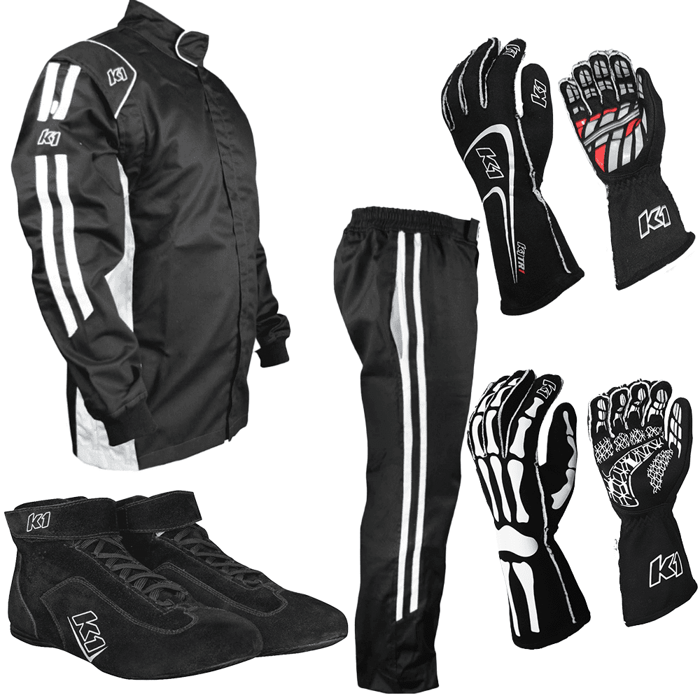 RaceDaySafety.com's K1 RaceGear Challenger Package includes: K1 RaceGear Challenger Race Jacket, K1 RaceGear Challenger Race Pants, K1 RaceGear Race Gloves and K1 RaceGear Challenger Race Shoes.