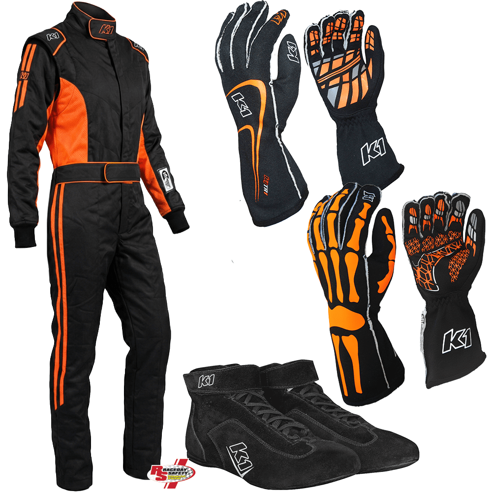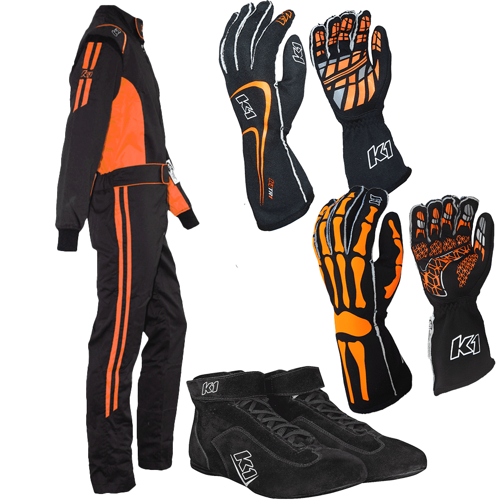 RaceDaySafety.com's K1 RaceGear Challenger Orange Package includes: K1 RaceGear Challenger Race Suit, K1 RaceGear Track-1 Race Gloves and K1 RaceGear Challenger Race Shoes.