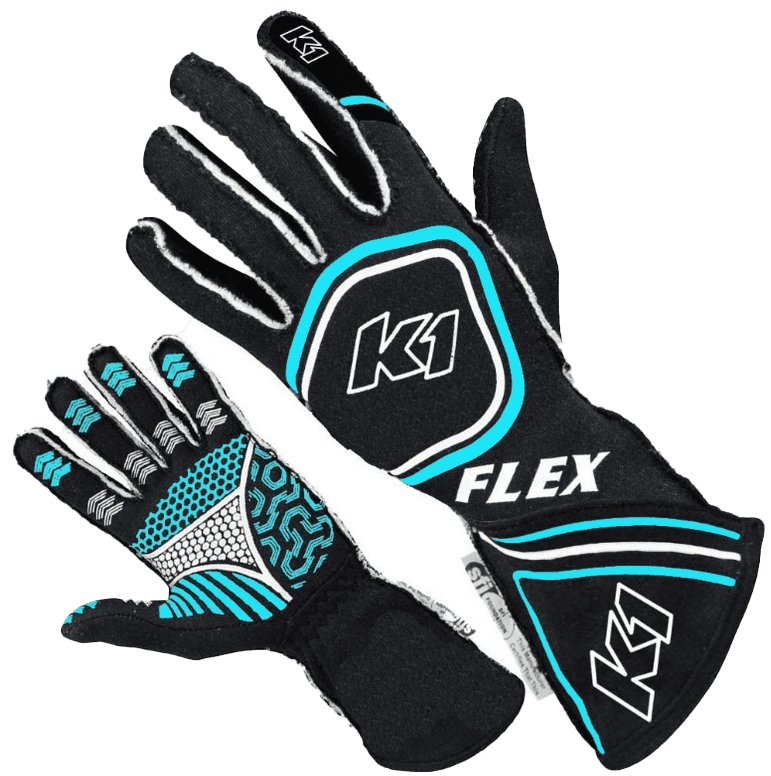 K1 RaceGear Flex Gloves Black/Fluorescent Blue. "What you see is what you get", so if you spot a Pro Driver wearing K1 Flex Gloves, you are getting Gloves with the same design, materials and construction. No one-off, special production Glove for the Pro, but a diluted version for the rest of us.