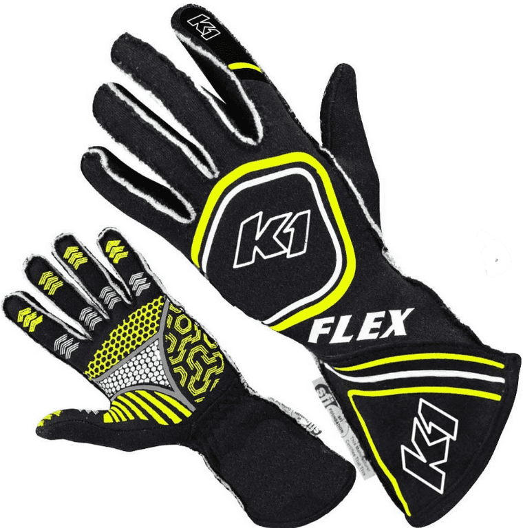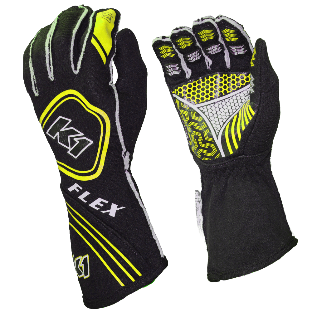 K1 RaceGear Flex Gloves Black/Fluorescent Yellow. "What you see is what you get", so if you spot a Pro Driver wearing K1 Flex Gloves, you are getting Gloves with the same design, materials and construction. No one-off, special production Glove for the Pro, but a diluted version for the rest of us.