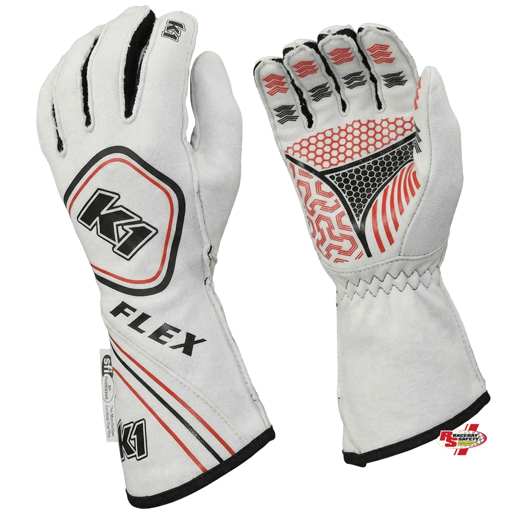K1 RaceGear Flex Gloves White. "What you see is what you get", so if you spot a Pro Driver wearing K1 Flex Gloves, you are getting Gloves with the same design, materials and construction. No one-off, special production Glove for the Pro, but a diluted version for the rest of us.