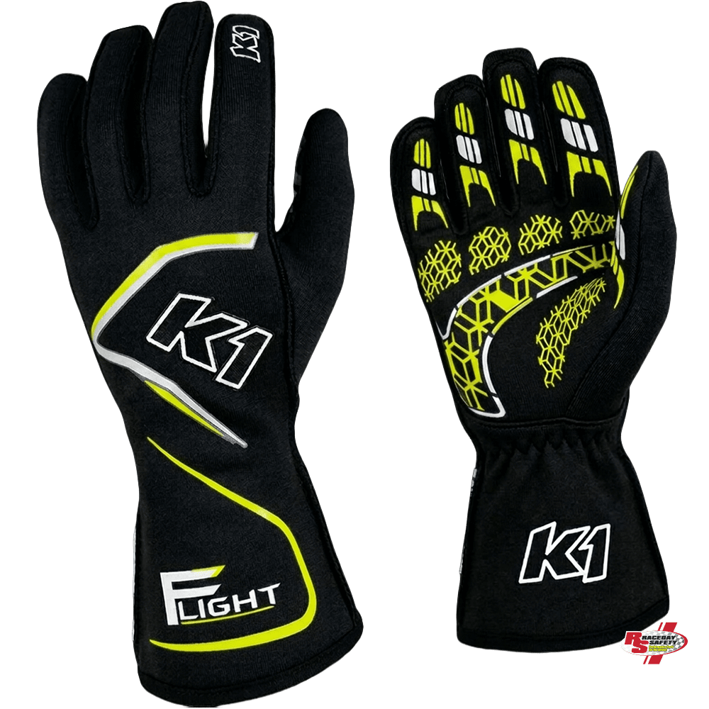 K1 RaceGear Flight Racing Gloves Black/Fluorescent Yellow. K1 Race Gear consulted with top Pro Racers and the K1 FLIGHT Gloves were developed as a premium alternative to the higher end products of Alpinestars, OMP and Sparco.