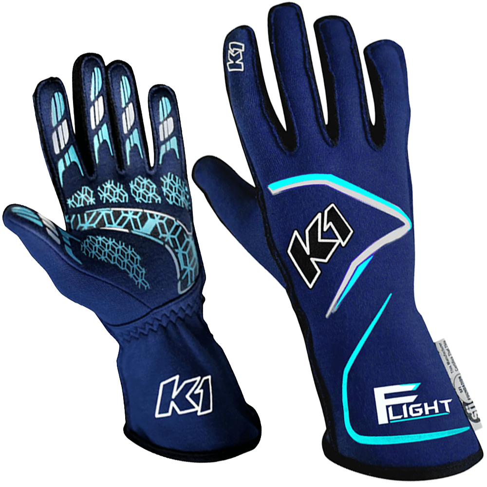 K1 RaceGear Flight Racing Gloves Navy Blue/Fluorescent Blue. K1 Race Gear consulted with top Pro Racers and the K1 FLIGHT Gloves were developed as a premium alternative to the higher end products of Alpinestars, OMP and Sparco.