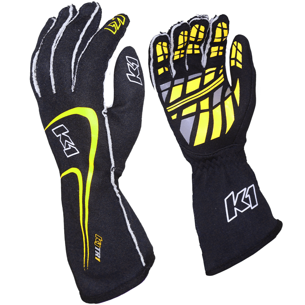 K1 RaceGear Track 1 Racing Gloves Black/Fluorescent Yellow. RaceDay Safety and K1 RaceGear collaborate to offer racers a wider variety of color options through our semi-custom Racing Glove program.