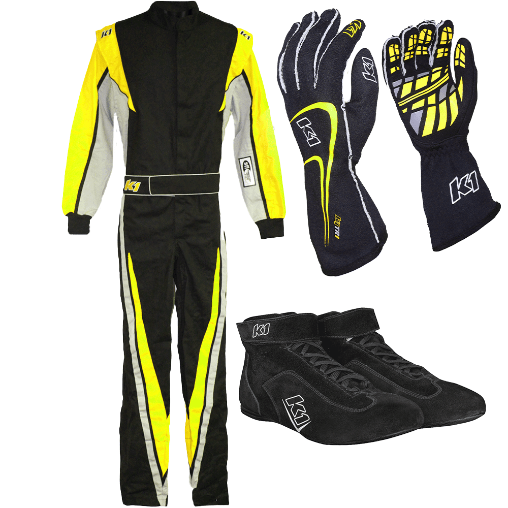 RaceDaySafety.com's K1 RaceGear Vortex Flo Yellow Package includes: K1 RaceGear Vortex Race Suit, K1 RaceGear Track-1 Race Gloves and K1 RaceGear Challenger Race Shoes.