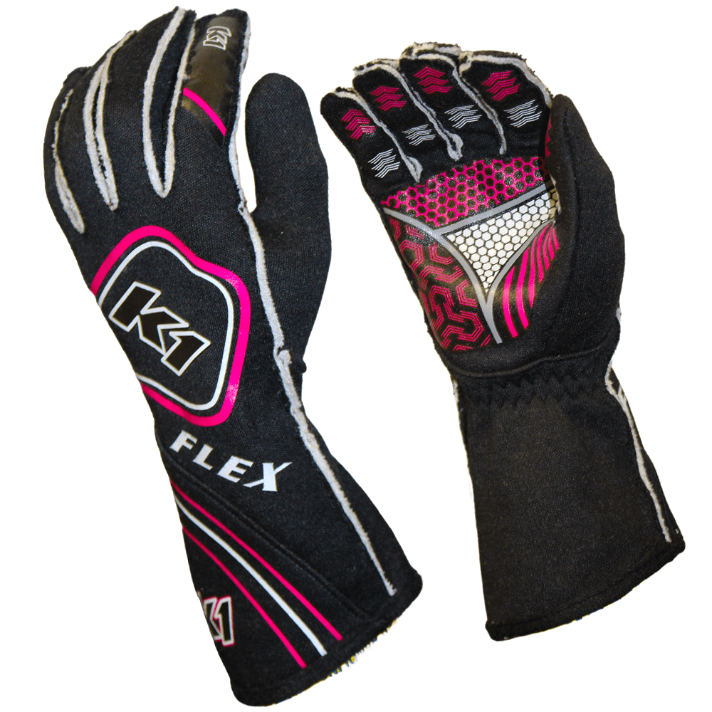K1 RaceGear Youth Flex Nomex® Gloves Black/Pink. K1 takes on the heavy hitters of the racing gear industry with their Youth Flex race gloves. A combination of flame retardant, Black Nomex® with Pink accent colors. K1 Race Gear's Flex Gloves have all the high end materials and features, without the high end price tag. These gloves feel and form nicely around the hands, a comfortable snugness, but not too tight of a fit.