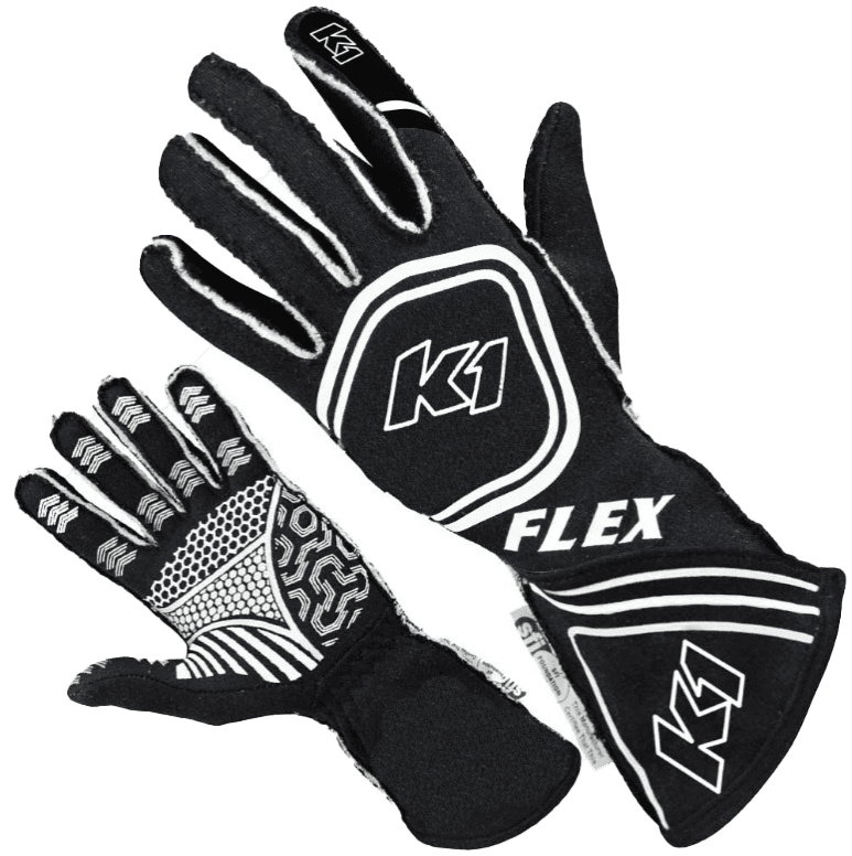 K1 RaceGear Youth Flex Nomex® Gloves Black/White. K1 takes on the heavy hitters of the racing gear industry with their Youth Flex race gloves. A combination of flame retardant, Black Nomex® with White accent colors. K1 Race Gear's Flex Gloves have all the high end materials and features, without the high end price tag. These gloves feel and form nicely around the hands, a comfortable snugness, but not too tight of a fit.