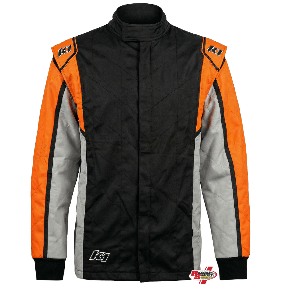 K1 RaceGear VORTEX Racing Jacket In Orange/Gray/Black. RaceDay Safety and K1 RaceGear collaborate to offer racers a wider variety of color options through our semi-custom race suit program. Design inspired by the popular K1 Victory Race Suit, the "Vortex Jacket" is highlighted by strategic placement of Fluorescent Orange, which really pops out alongside Gray accents and the Black main body.