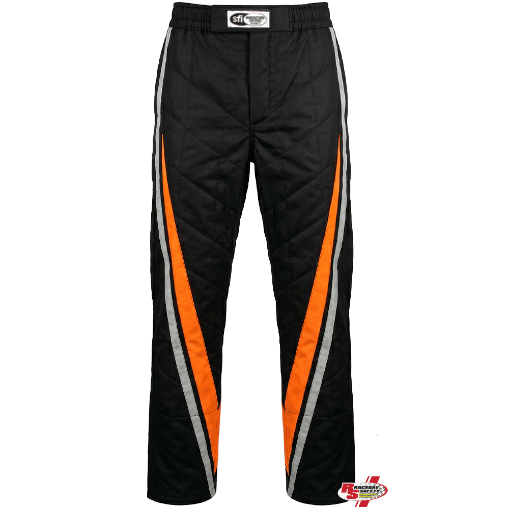 K1 RaceGear VORTEX Racing Pants In Orange/Gray/Black. RaceDay Safety and K1 RaceGear collaborate to offer racers a wider variety of color options through our semi-custom race suit program. Design inspired by the popular K1 Victory Race Suit, the "Vortex" consists of a Black main body with Gray and Fluorescent Orange leg striping.