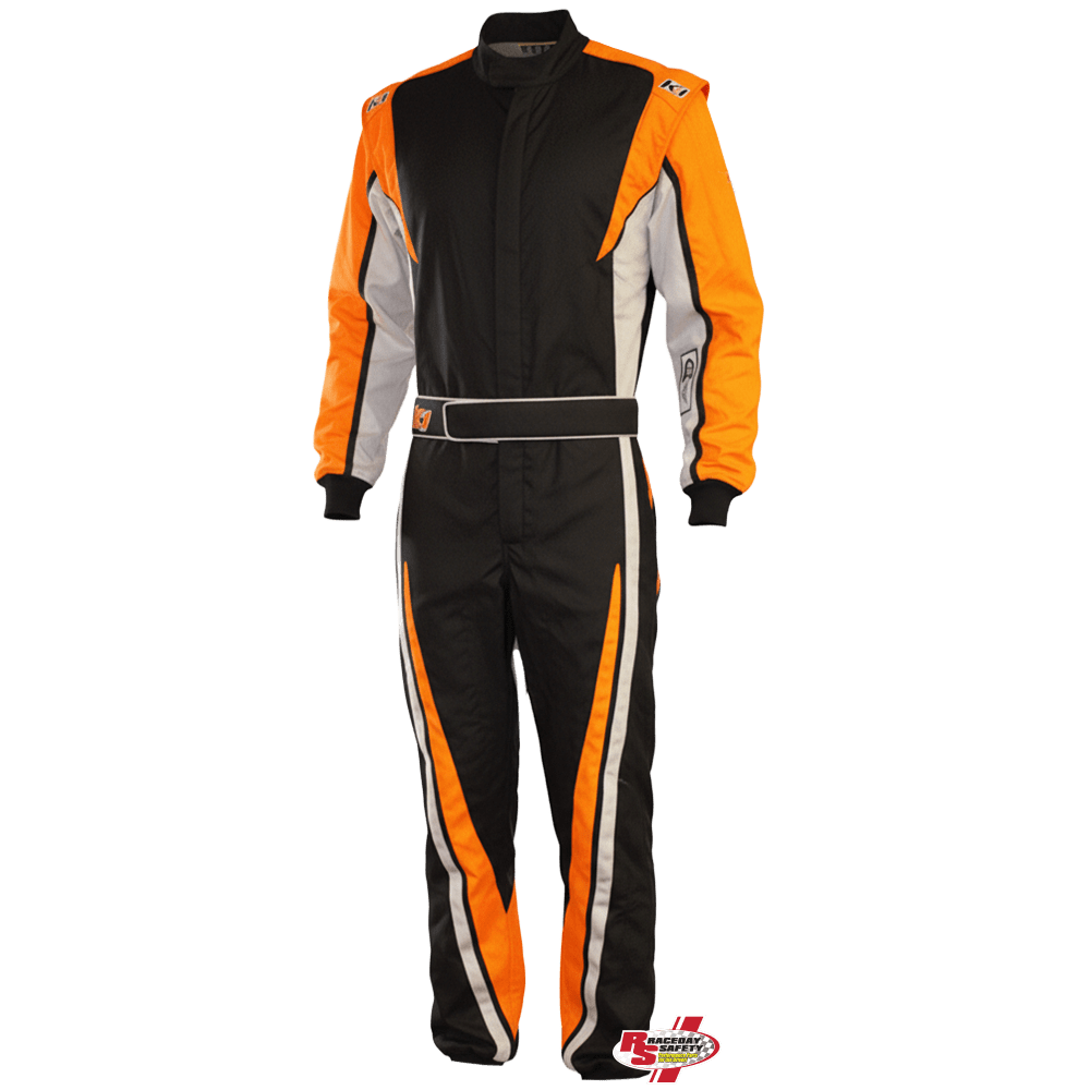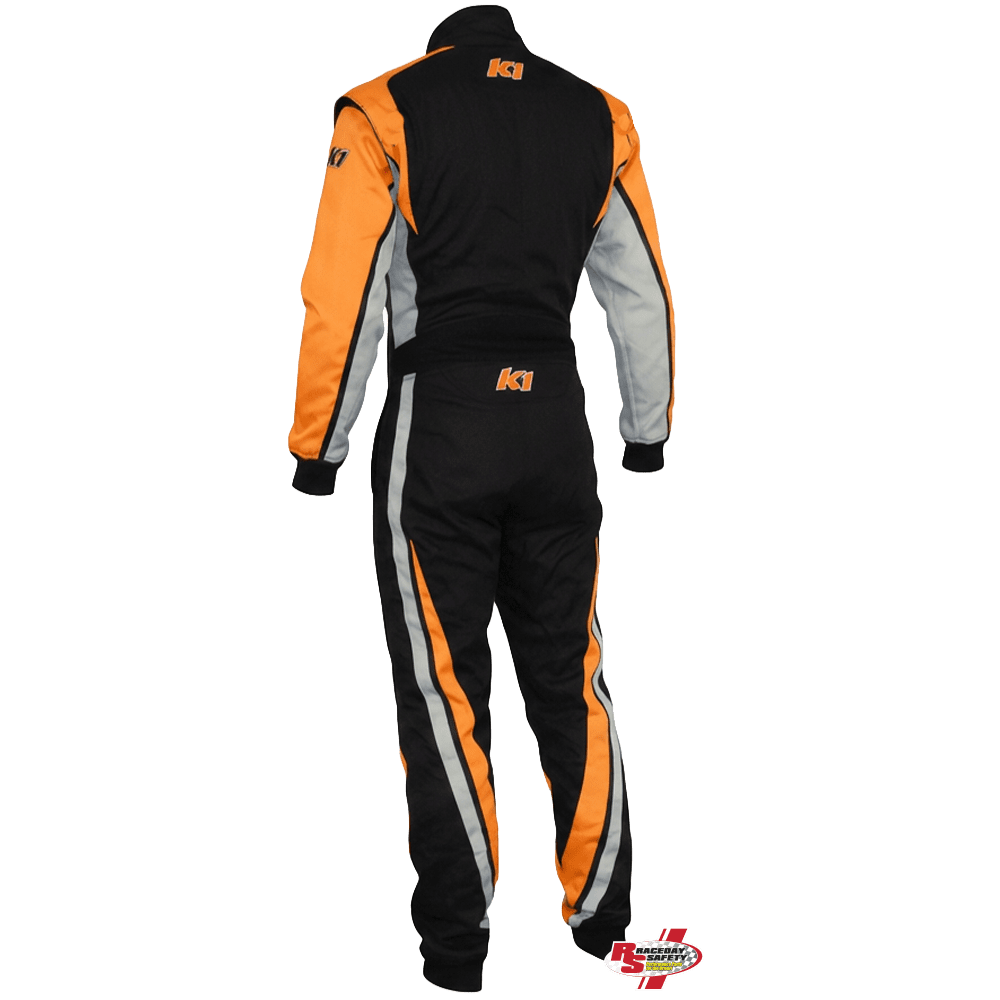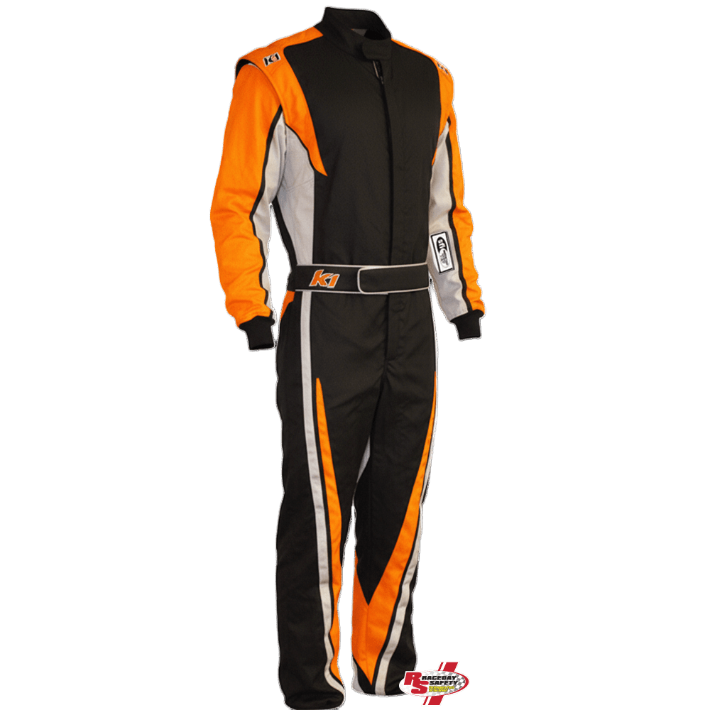 K1 RaceGear VORTEX Racing Suit In Orange/Gray/Black. RaceDay Safety and K1 RaceGear collaborate to offer racers a wider variety of color options through our semi-custom race suit program. Design inspired by the popular K1 Victory Race Suit, the "Vortex" is highlighted by strategic placement of Fluorescent Orange, which really pops out alongside Gray accents and the Black main body. Behind the Race Suit's colorway, a Lower Back Stretch Panel and Arm Gussets are built-in features to enhance driver comfort.