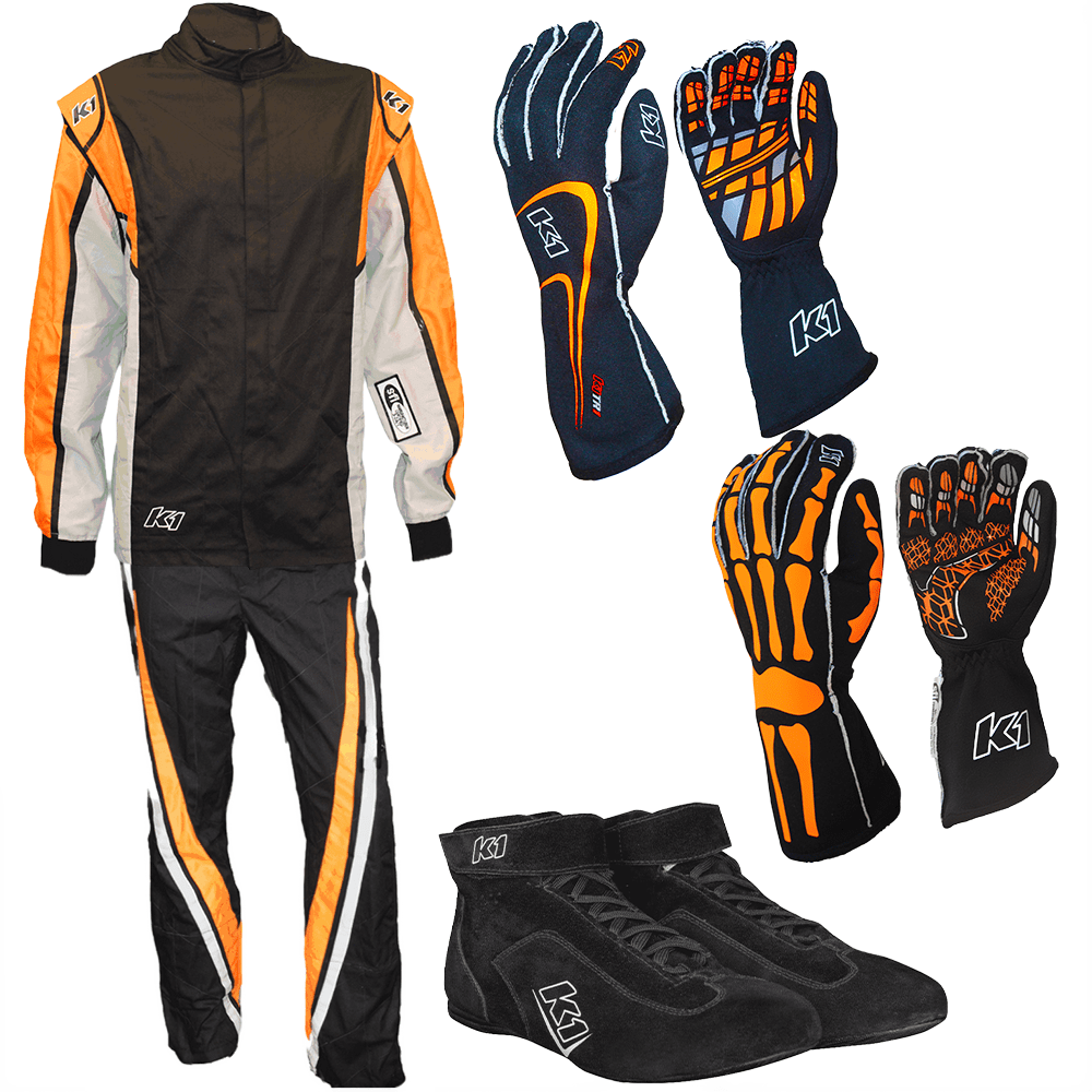 Only available at RaceDay Safety, the K1 RaceGear Vortex Orange Jacket and Pant Driver Package! Inspired by the design of the popular K1 RaceGear Victory Suit, we had K1 add Gray and Orange accent colors to create a custom looking Race Jacket and Pant set. Throw in the Black and Orange Race Gloves and Challenger Race Shoes to complete the eye catching combination.