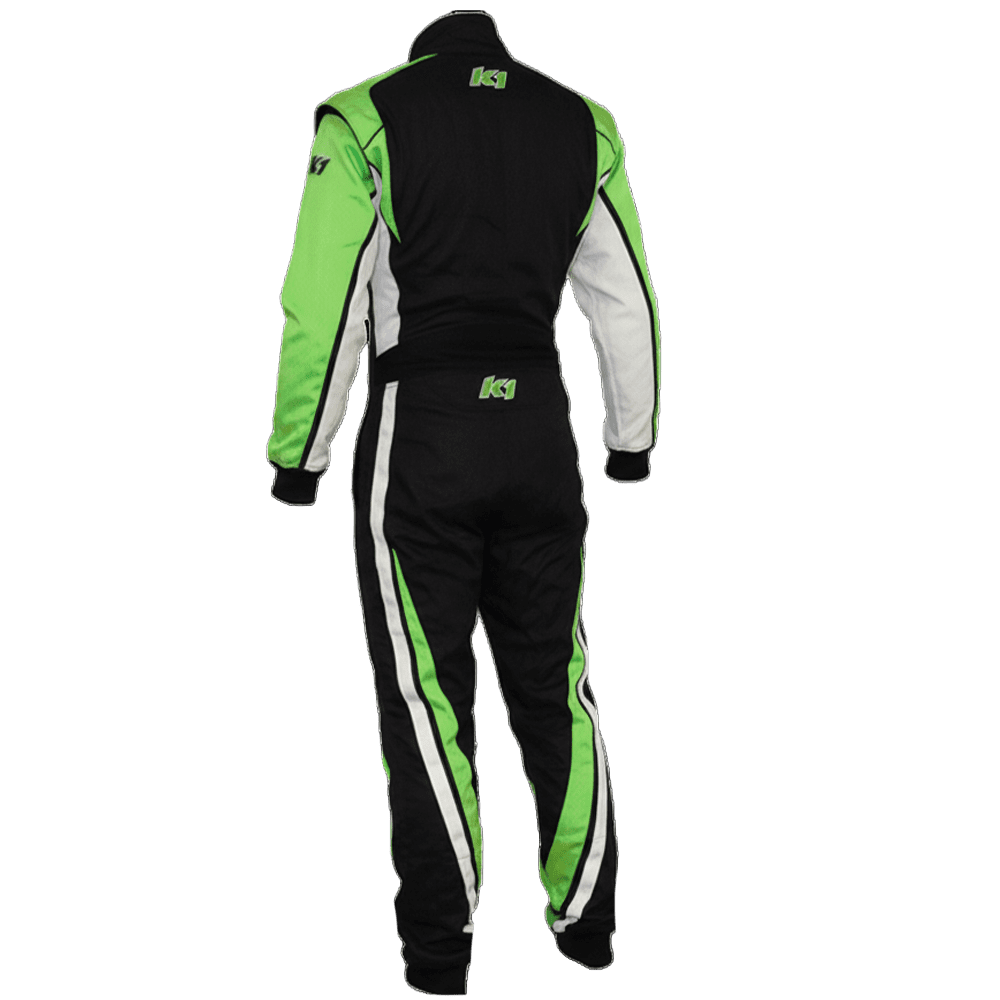 RaceDaySafety.com's K1 RaceGear Vortex Flo Green Package includes: K1 RaceGear Vortex Race Suit, K1 RaceGear Track-1 Race Gloves and K1 RaceGear Challenger Race Shoes.