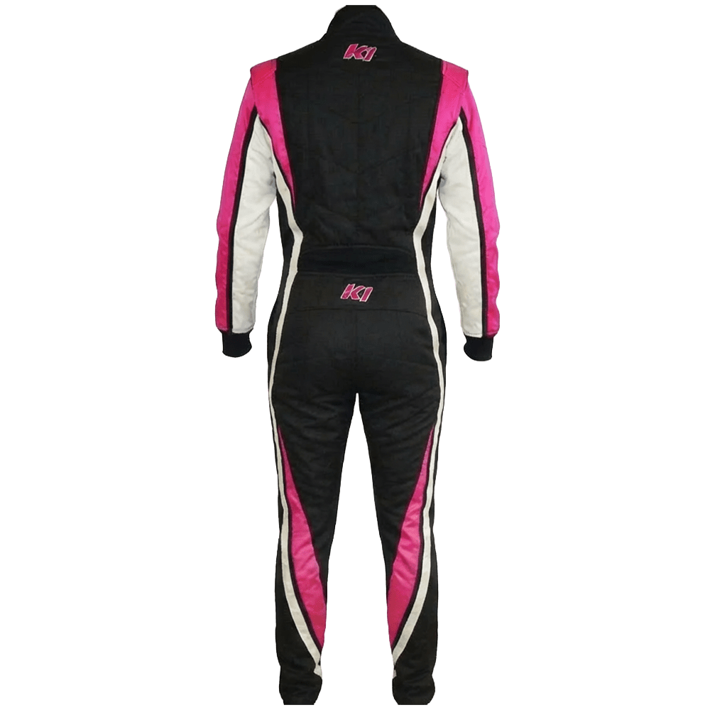 RaceDaySafety.com's K1 RaceGear Vortex Flo Pink Package includes: K1 RaceGear Vortex Race Suit, K1 RaceGear Track-1 Race Gloves and K1 RaceGear Challenger Race Shoes.
