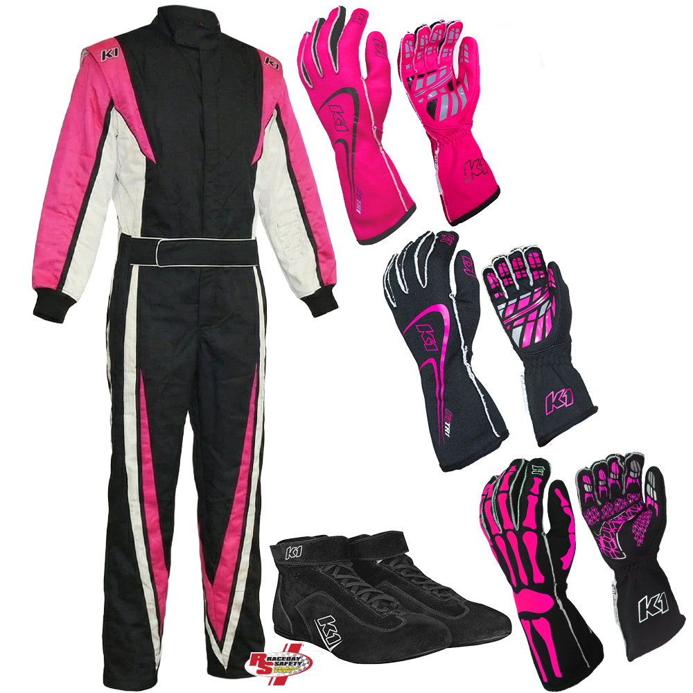 RaceDaySafety.com's K1 RaceGear Vortex Flo Pink Package includes: K1 RaceGear Vortex Race Suit, K1 RaceGear Race Gloves and K1 RaceGear Challenger Race Shoes.