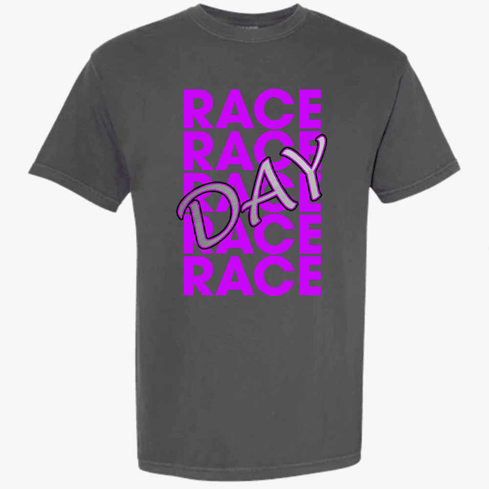 Race Day Pepper (Dark Gray) Comfort Colors Tee with Purple graphic print.