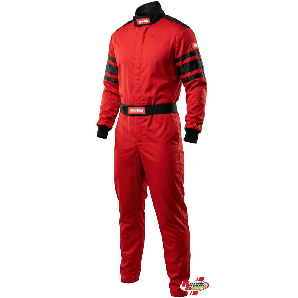RaceQuip One Piece Single Layer Fire Suit Red. Competitive price point and superior construction techniques make the RaceQuip Race Suit a good purchase. The premium zipper helps prevent the most common form of fire suit failure...broken zippers. Advanced stitching techniques helps prevent the second most common form of fire suit failure...unraveling or torn seams. Overall appearance of the race suit adds a professional look to any driver or race team without exceeding the budget. The RaceQuip 110 Series Race Suit is constructed from Red flame retardant fabric with contrasting Black arm stripes.