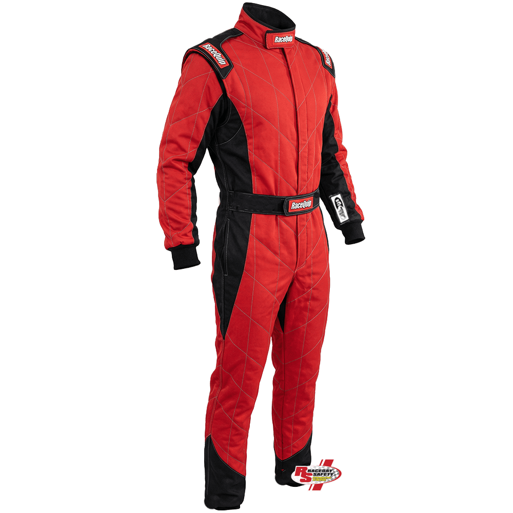 RaceQuip Chevron-5 Racing Suit in Red and Black. For decades, RaceQuip's main line has been the race suit constructed from FRC or fire retardant cotton. This material is relatively inexpensive and gets good numbers when undergoing flame and heat testing. The downside of FRC: it's a heavy material and the protection can start to wear off after years of repeated washings. RaceQuip prides themselves on the "Value" of their products...quality gear and good prices, which made it difficult to produce a race suit constructed from the more expensive Nomex material...until now! Introducing RaceQuip's Chevron-5 Race Suit, made from 2 layers of soft, lightweight, flame retardant Nomex which will always retain it's protective properties when washed.