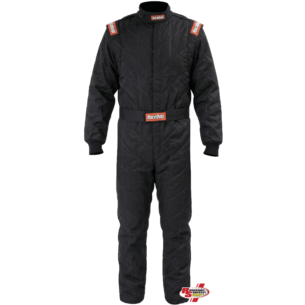 RaceQuip Chevron-5 Racing Suit in Black. For decades, RaceQuip's main line has been the race suit constructed from FRC or fire retardant cotton. This material is relatively inexpensive and gets good numbers when undergoing flame and heat testing. The downside of FRC: it's a heavy material and the protection can start to wear off after years of repeated washings. RaceQuip prides themselves on the "Value" of their products...quality gear and good prices, which made it difficult to produce a race suit constructed from the more expensive Nomex material...until now! Introducing RaceQuip's Chevron-5 Race Suit, made from 2 layers of soft, lightweight, flame retardant Nomex which will always retain it's protective properties when washed.