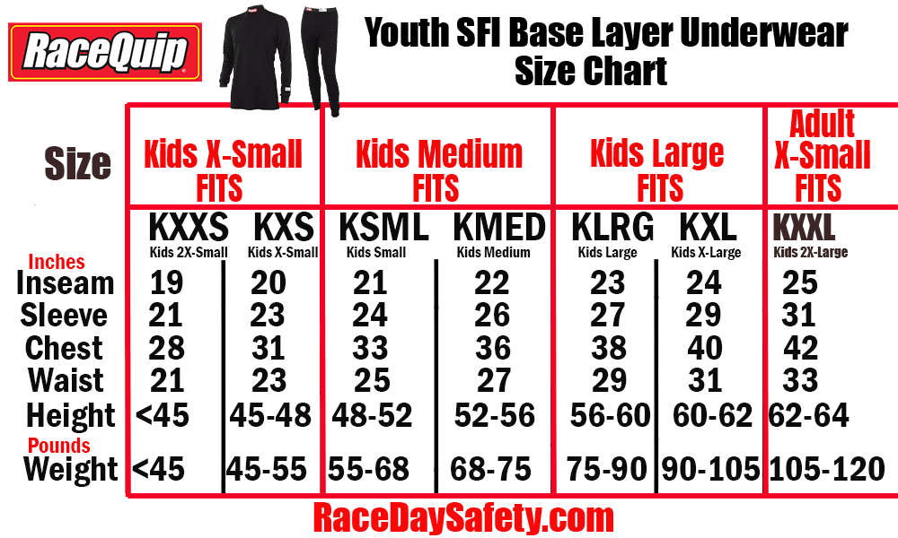 RaceQuip Youth SFI 3.3 Fire Retardant Underwear Top. Add an additional protective layer to your young racer and dramatically increase their overall protection against extreme heat and flames. The fabric is just as light and comfortable as their favorite t-shirt, so you should have no problem getting them to wear it.