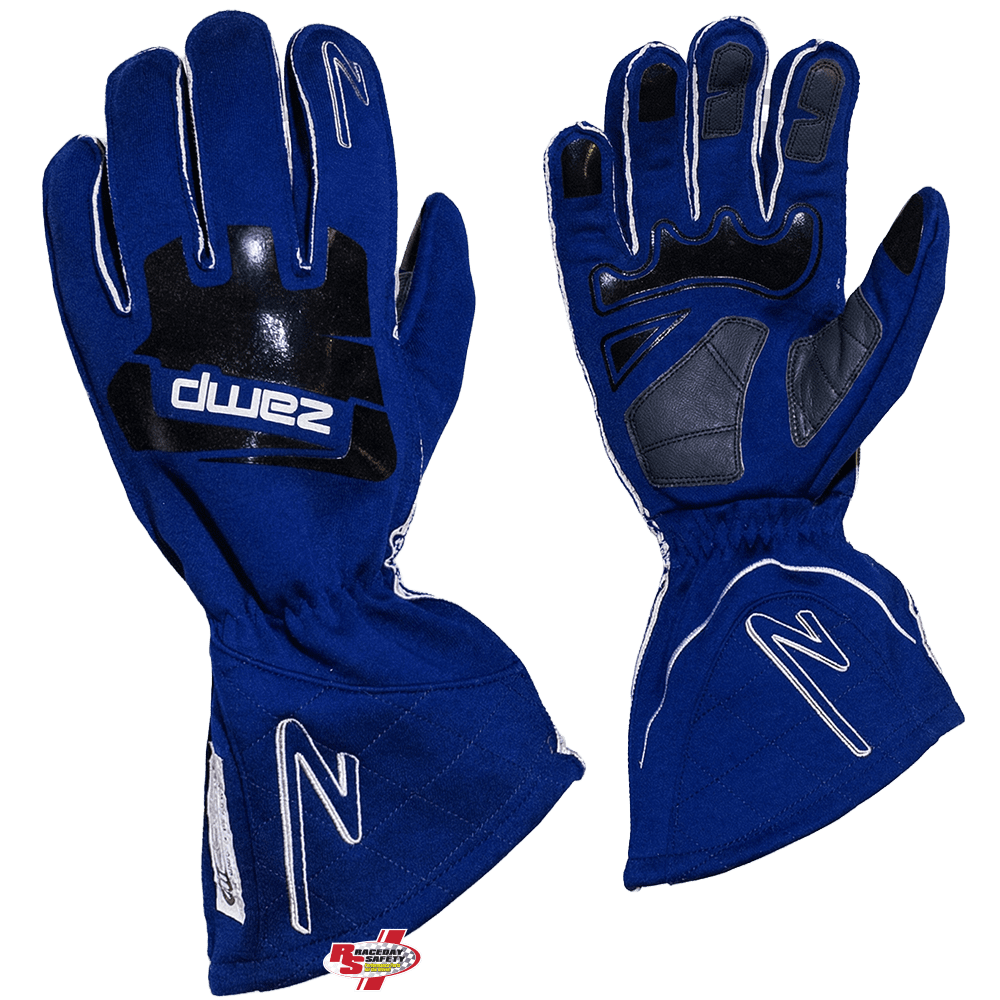 Zamp ZR-50 Race Gloves Blue. Zamp has put a lot of thought into the development of the ZR-50 Race Gloves. As your hand slides through the elastic closure, you will first notice the wide wrist gauntlet easily clears your race suit sleeve cuff. The pre-curved fingers guide your hands to a comfortable steering wheel position. Exterior stitching leaves clean, smooth seams against your fingers, reducing irritation. A combination of strategically placed leather and silicone pads are placed in the palm and finger areas for enhanced grip. Zamp ZR-50 racing gloves are manufactured with 2 layers of Blue flame and heat retardant fabric.