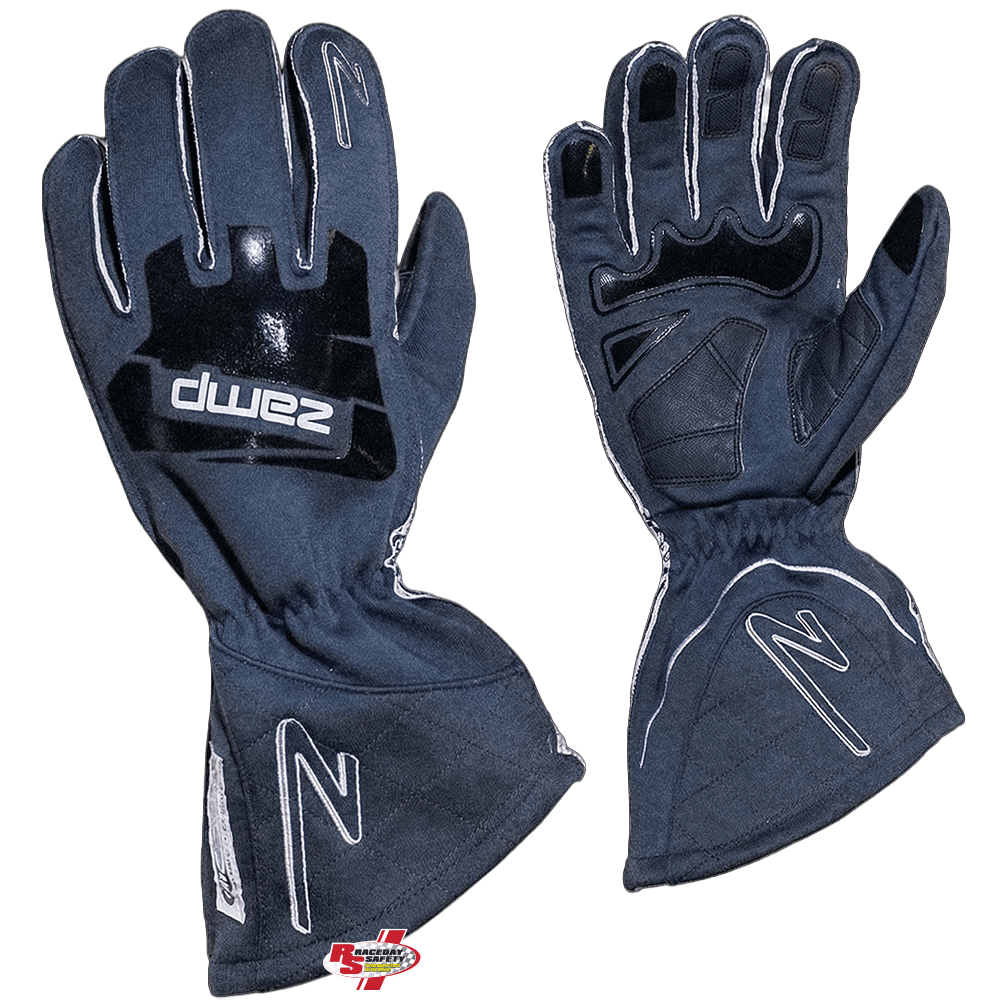 Zamp ZR-50 Race Gloves Gray. Zamp has put a lot of thought into the development of the ZR-50 Race Gloves. As your hand slides through the elastic closure, you will first notice the wide wrist gauntlet easily clears your race suit sleeve cuff. The pre-curved fingers guide your hands to a comfortable steering wheel position. Exterior stitching leaves clean, smooth seams against your fingers, reducing irritation. A combination of strategically placed leather and silicone pads are placed in the palm and finger areas for enhanced grip. Zamp ZR-50 racing gloves are manufactured with 2 layers of darker Gray flame and heat retardant fabric.