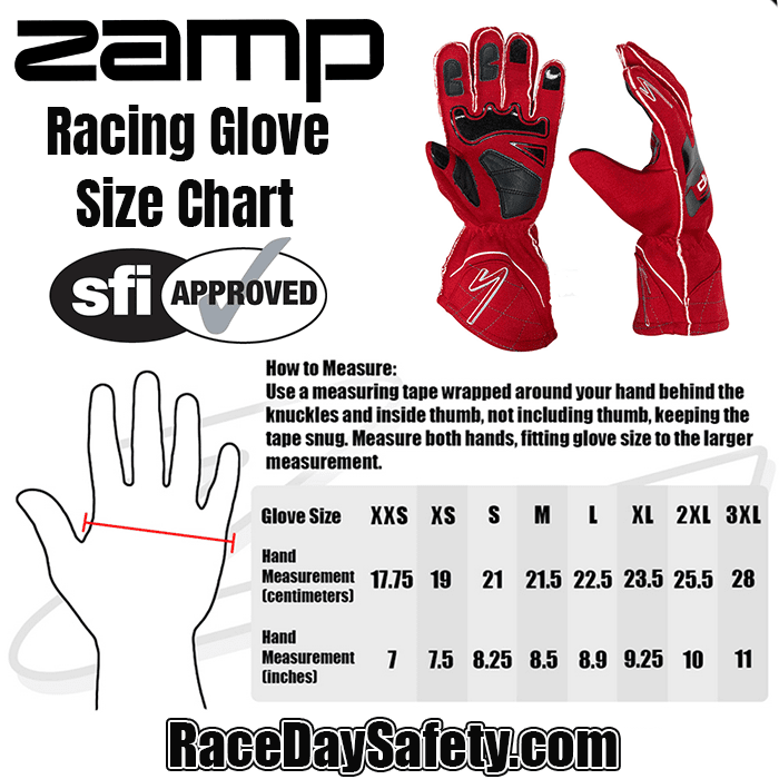 Zamp ZR-50 Race Gloves Red. Zamp has put a lot of thought into the development of the ZR-50 Race Gloves. As your hand slides through the elastic closure, you will first notice the wide wrist gauntlet easily clears your race suit sleeve cuff. The pre-curved fingers guide your hands to a comfortable steering wheel position. Exterior stitching leaves clean, smooth seams against your fingers, reducing irritation. A combination of strategically placed leather and silicone pads are placed in the palm and finger areas for enhanced grip. Zamp ZR-50 racing gloves are manufactured with 2 layers of Red flame and heat retardant fabric.