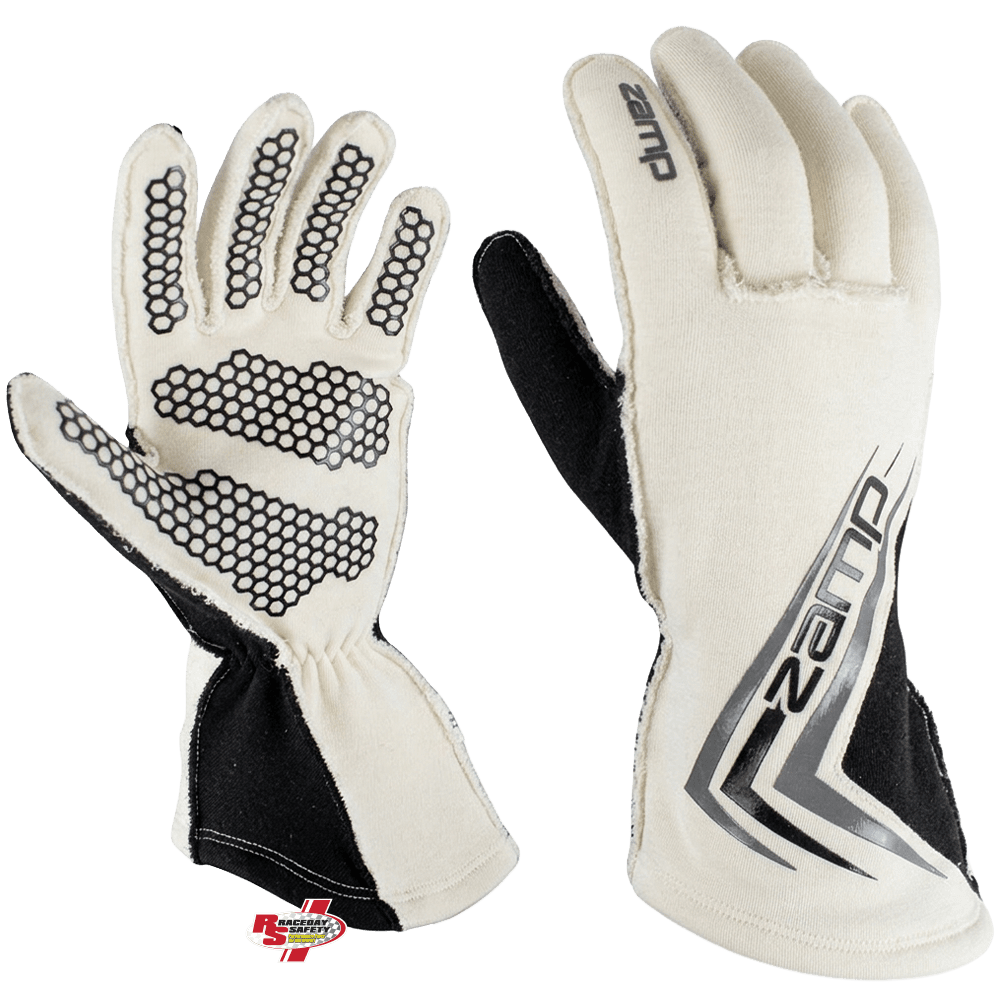 Zamp ZR-60 Race Gloves White. These racing gloves slip easily onto your hand. The extra wide lower gauntlet area clears your race suit sleeve cuff without bunching into it. You hardly notice any seams against your hands due to the exterior stitching. A reasonably high grip silicone pattern on the palm and fingers for good steering wheel contact. The ZR-60 is Zamp's initial entry into the lightweight, premium racing glove sector and based on our original inspection, we think they offer all the features that category demands.